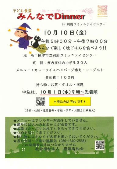 10月の子ども食堂のお申込みは、10月1日(水)9時より受付けます。 下記の日時で開催しますので、ぜひご参加ください!