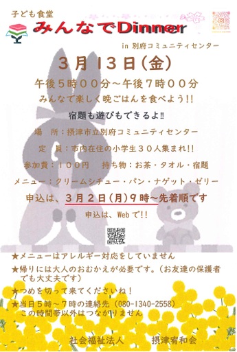 3月の子ども食堂のお申込みは、3月2日(月)9時より受付けます。 下記の日時で開催しますので、ぜひご参加ください!